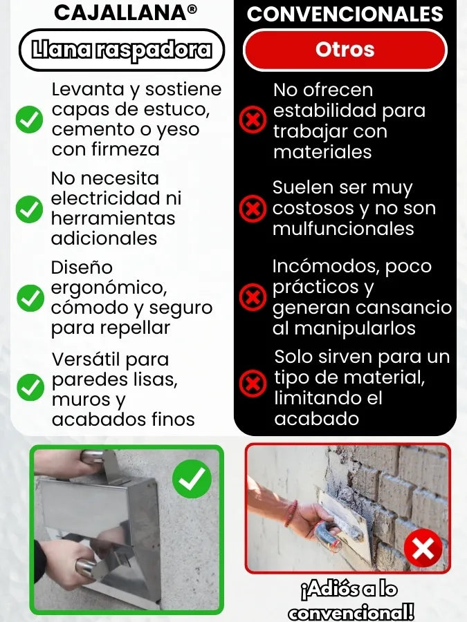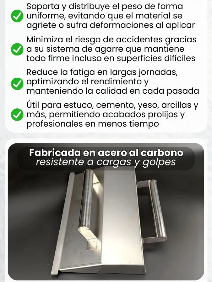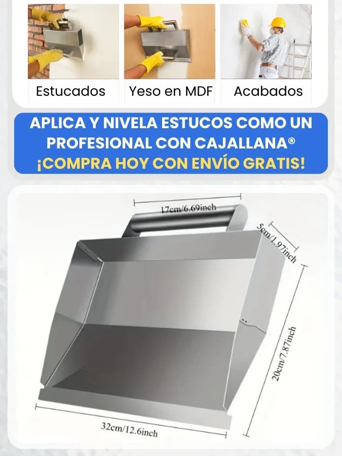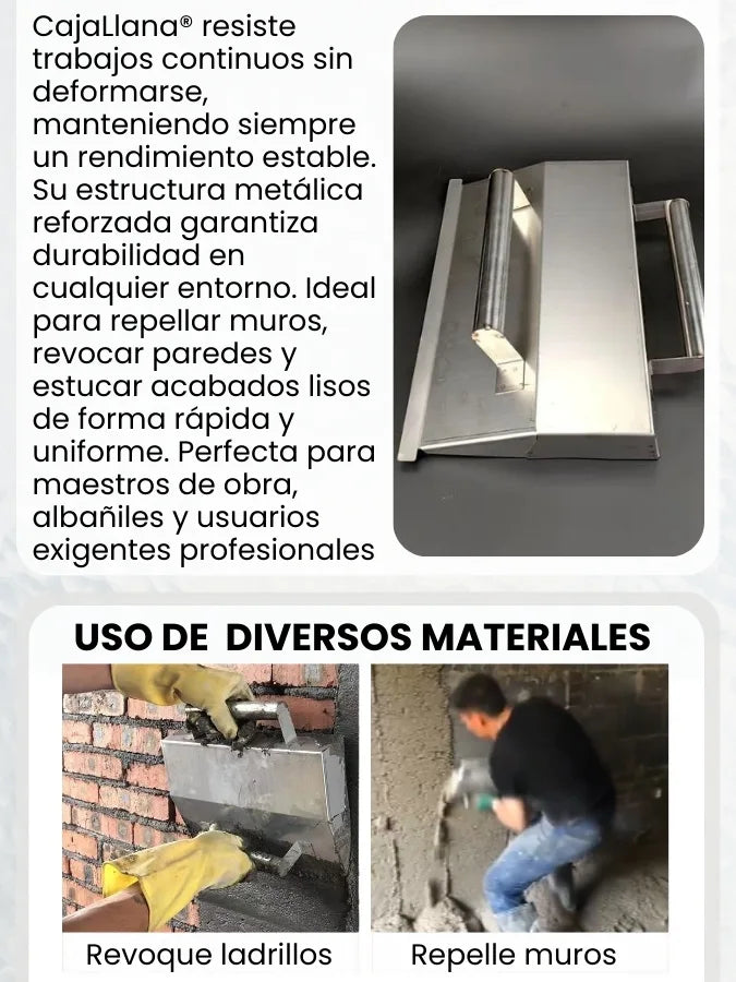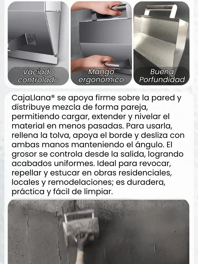 La CajaLlana® está diseñada para aplicar de forma rápida y uniforme estuco, yeso, mortero u otros recubrimientos en paredes y superficies. Permite trabajar más rápido que con herramientas tradicionales, logrando acabados profesionales sin tanto esfuerzo.