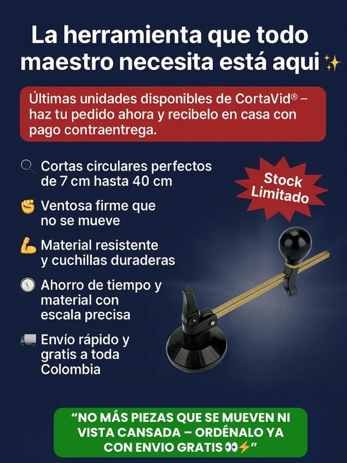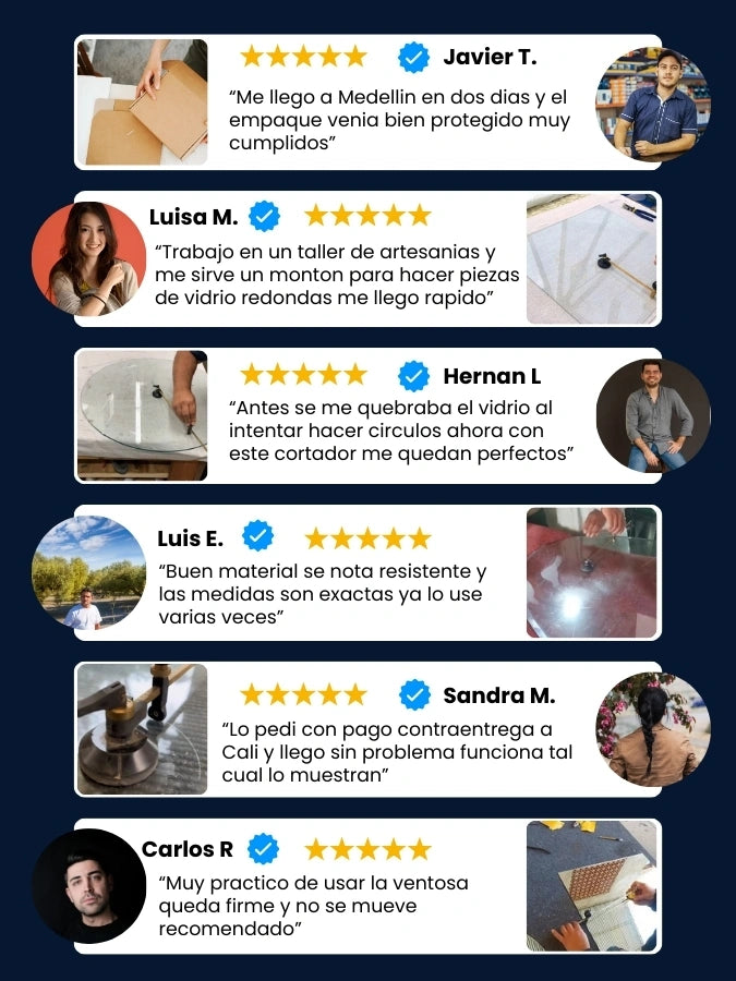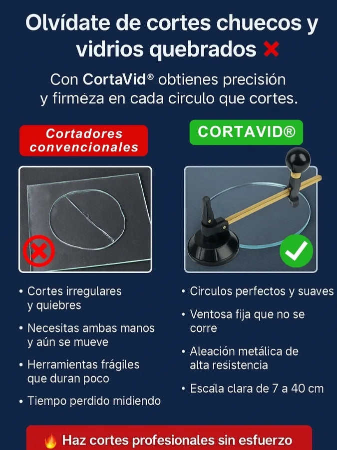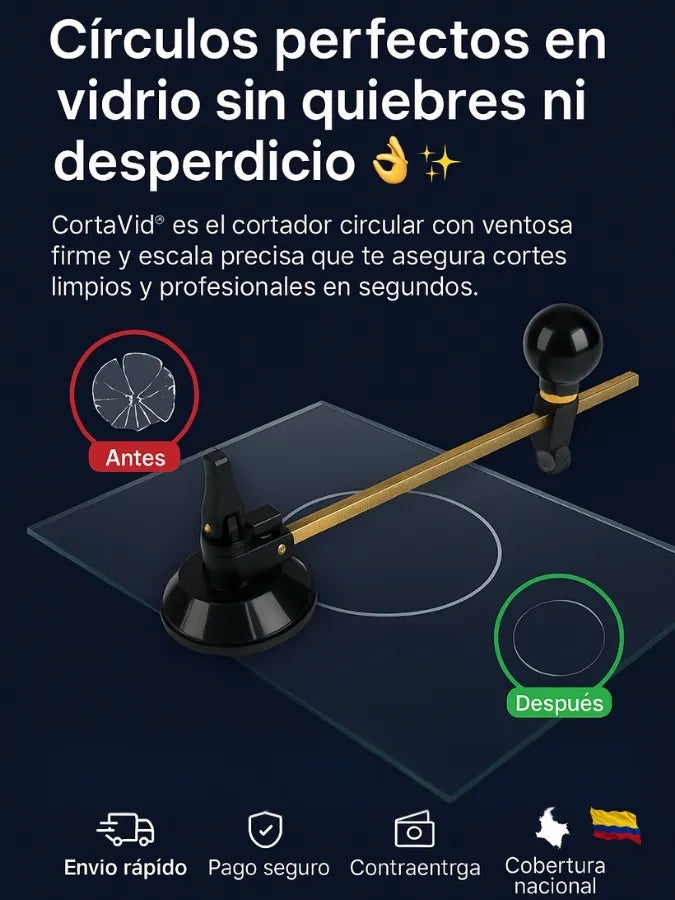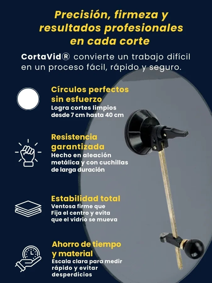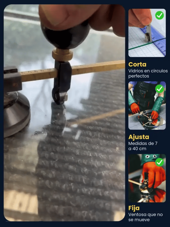 Su ventosa central fija el vidrio y evita que se mueva, garantizando cortes limpios y sin quiebres.