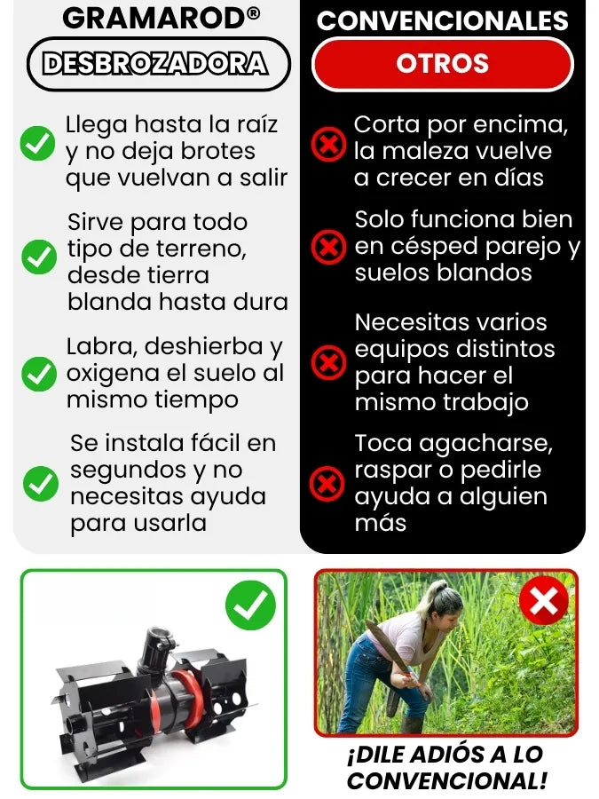 GramaRod® es un accesorio que se acopla a desbrozadoras con motor a gasolina (2 tiempos o 4 tiempos). No tiene motor propio.