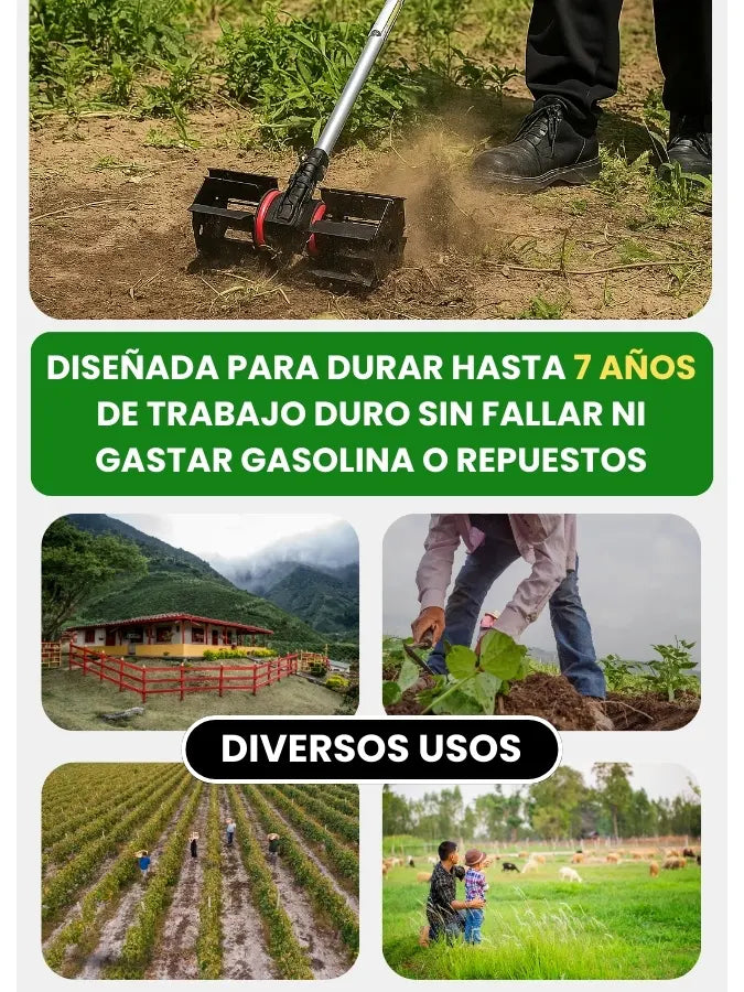 Funciona perfectamente en terrenos húmedos, áridos, duros, pedregosos, con gramilla, monte o suelo suelto. Ideal para cultivos como papa, cebolla, arroz, plátano, entre otros.