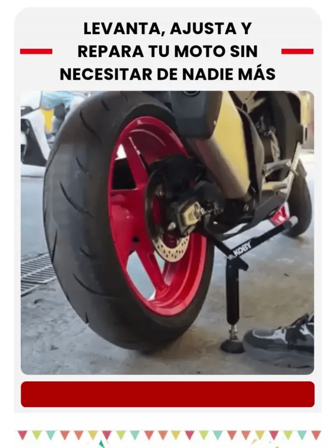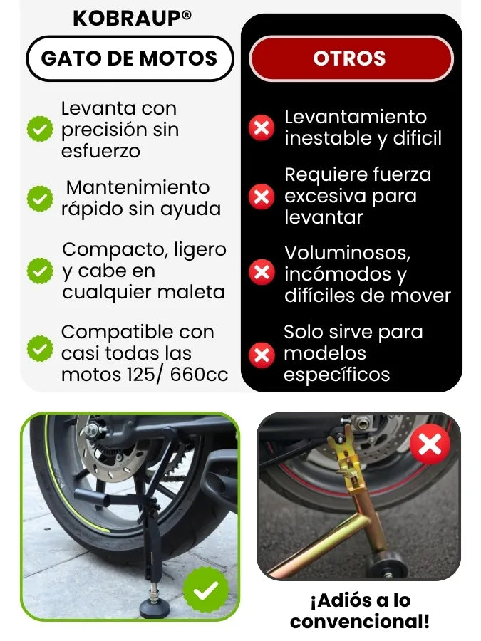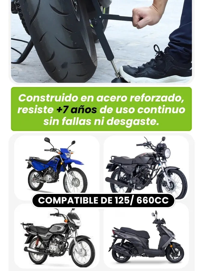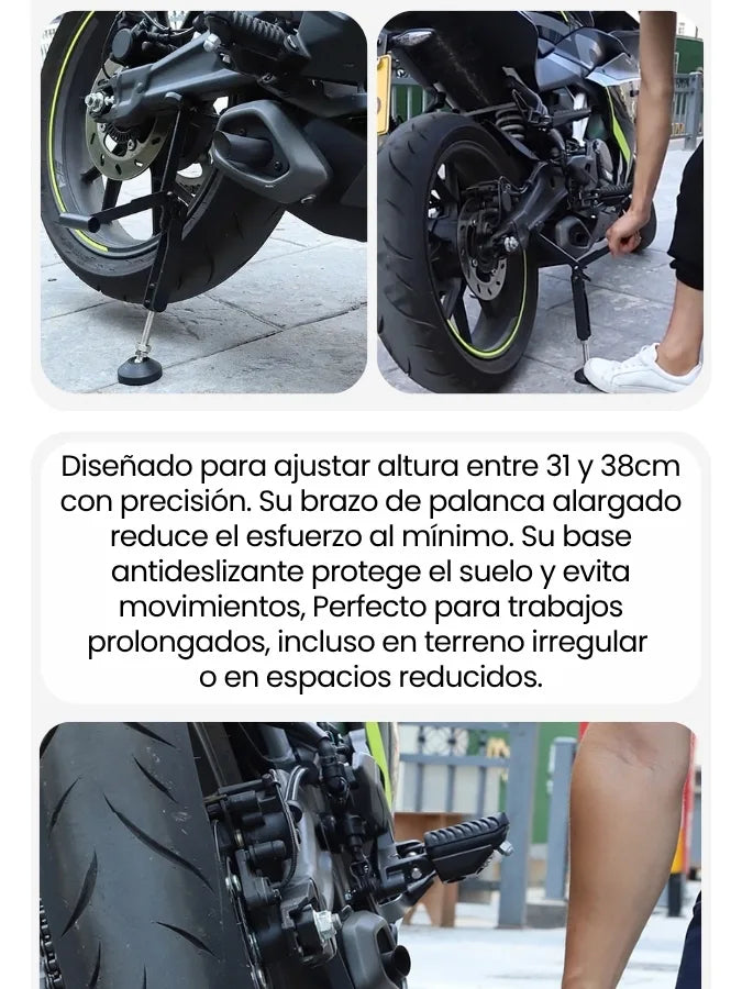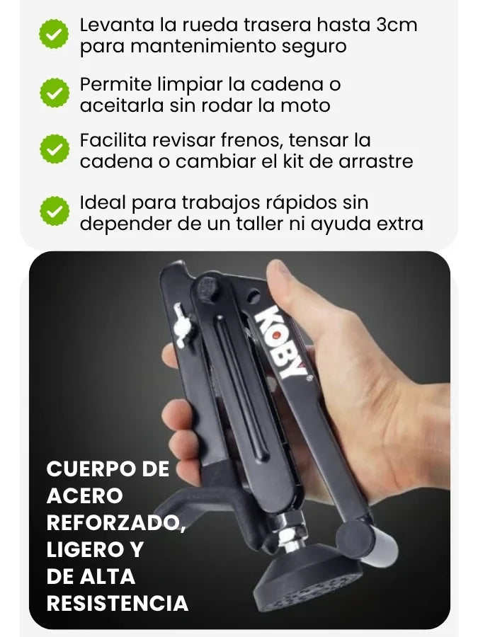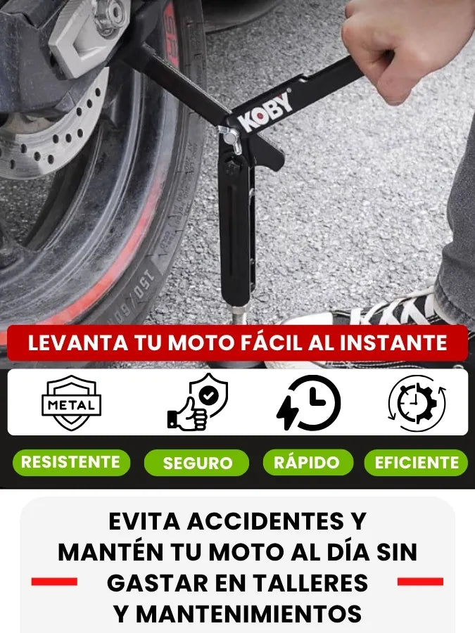 El KobraUp® está fabricado en acero reforzado de alta resistencia y puede soportar hasta 250 kg de peso, suficiente para motos medianas y grandes dentro del rango especificado.