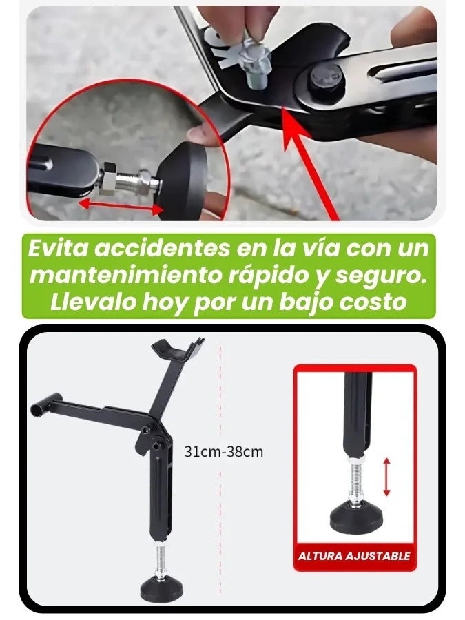KobraUp® puede levantar la rueda trasera hasta 3 cm del suelo, ideal para limpiar la cadena, revisar frenos, cambiar neumáticos o hacer ajustes sin ayuda adicional. El soporte Pesa menos de 1 kg y tiene un diseño compacto y plegable, lo que lo hace fácil de guardar en una mochila o llevar en viajes largos sin ocupar mucho espacio.