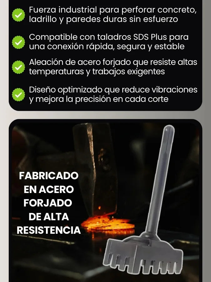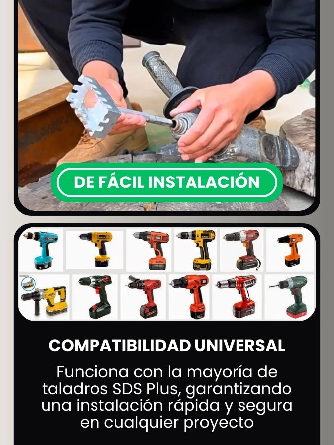 Es compatible con taladros SDS Plus eléctricos con eje estándar. Asegúrate de que tu taladro tenga buena potencia y sea de uso profesional o semiprofesional.