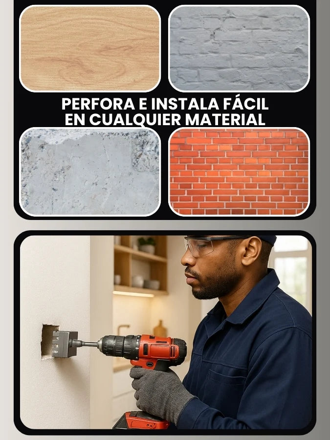 La zona de perforación es de aproximadamente 8.6 cm de ancho, ideal para cajas de instalación eléctrica cuadradas estándar.