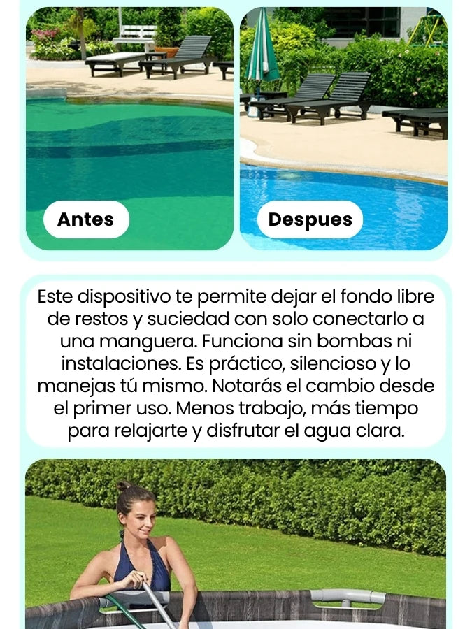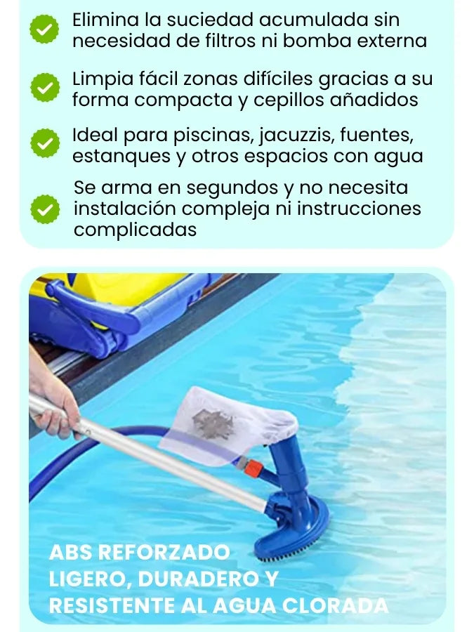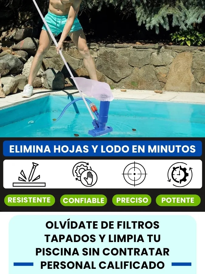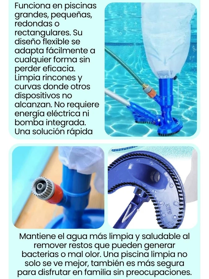 A diferencia de las aspiradoras eléctricas que requieren instalación, energía y mantenimiento costoso, PoolClean® es portátil, económico, fácil de usar y no depende de corriente eléctrica ni filtros. Es ideal para quienes quieren mantener la piscina limpia sin invertir en equipos complicados o costosos.